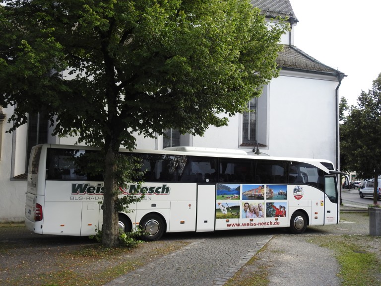 ... während Fahrer Markus den Bus perfekt vor der Kirche ...