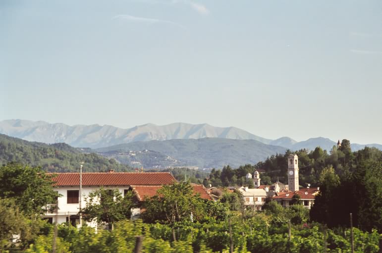 nochmal den Blick auf die Po-Ebene mit Pfirsich-Plantagen und Reisfeldern