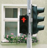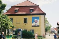 Nebenan schaut noch Papst Johannes Paul II aus dem Fenster.