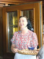 Die Chefin empfängt uns traditionell vor der Tür mit Brot