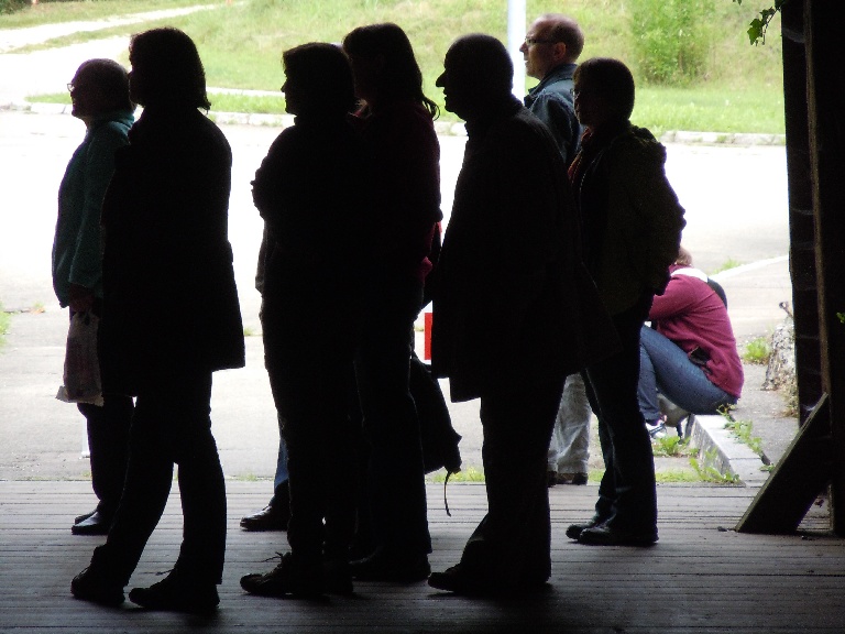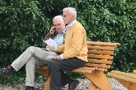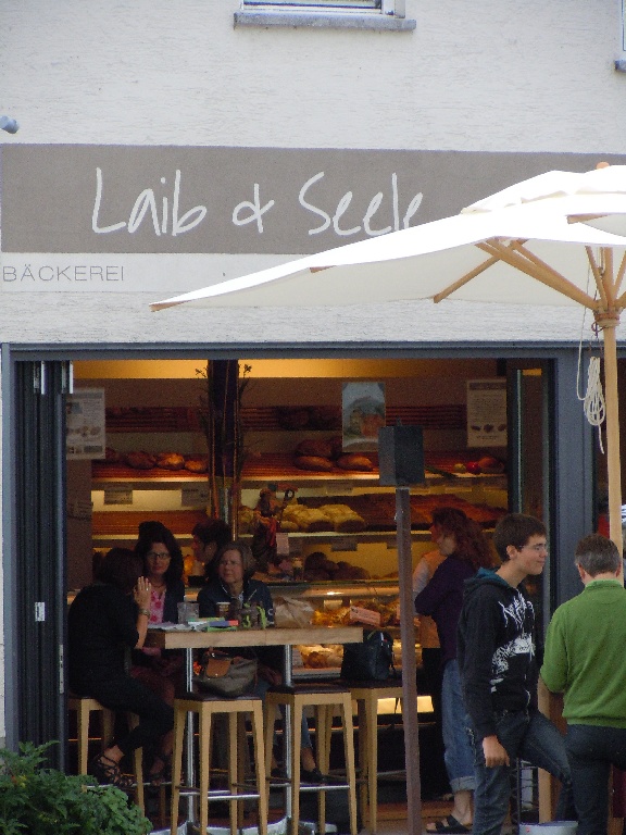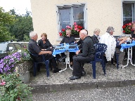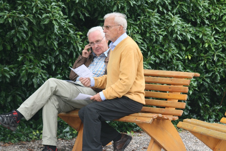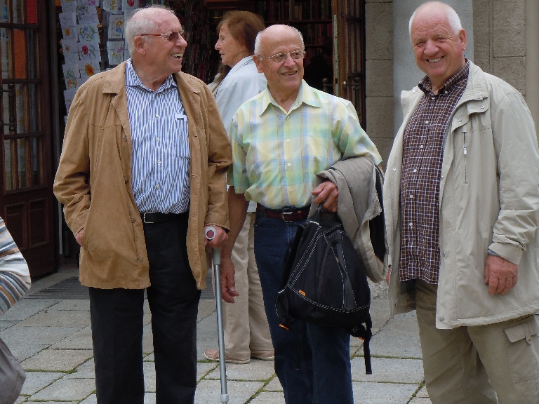 Vor dem Klosterladen besprechen rüstige Rentner, was es noch