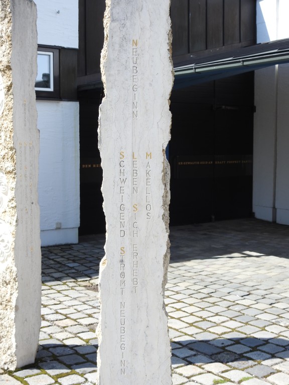 Im Innenhof sehen wir steinerne Stelen mit eingemeißelten